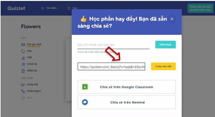 +) Khi hoàn thành phần một bài học, hệ thống sẽ tự động hiện địa chỉ bài học, giáo viên copy địa chỉ này và chia sẻ với học sinh. Với cách này, học sinh không cần có tài khoản trên Quizlet cũng có thể tham gia học tập.